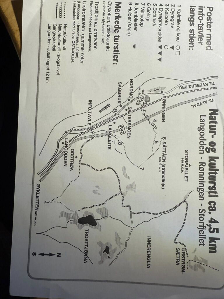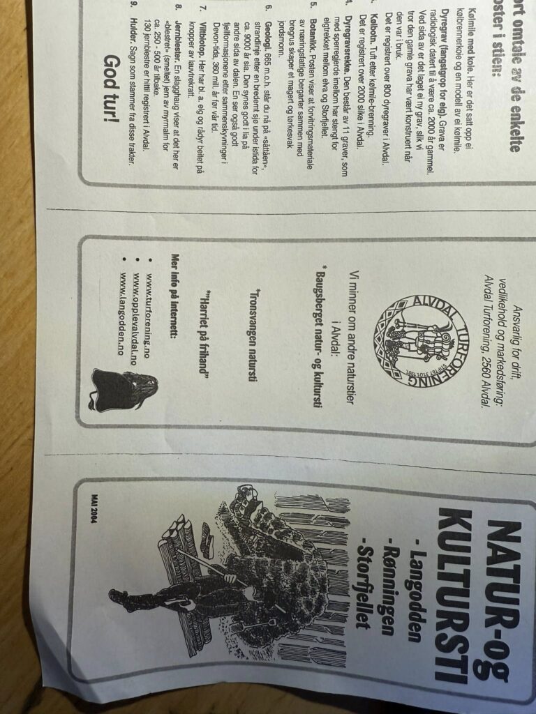 Natur – og kultursti «Langodden-Rønningen-Storfjellet» ble åpnet første gang 24.juni 1994. En del brukt av privatpersoner, turister og skoler, men vær og vind over lang tid merkes, og det var igjen tid for en oppussing av skilt og stier, noe som er gjort i sommer. Lignende jobb er gjort flere ganger i stiens levetid. Formelt er det Østkjølen Utmarkslag ved grunneierne som eier stien,det er Alvdal Turforening som har det praktiske vedlikeholds ansvaret i avtaleform og gjort dette i alle år![]()