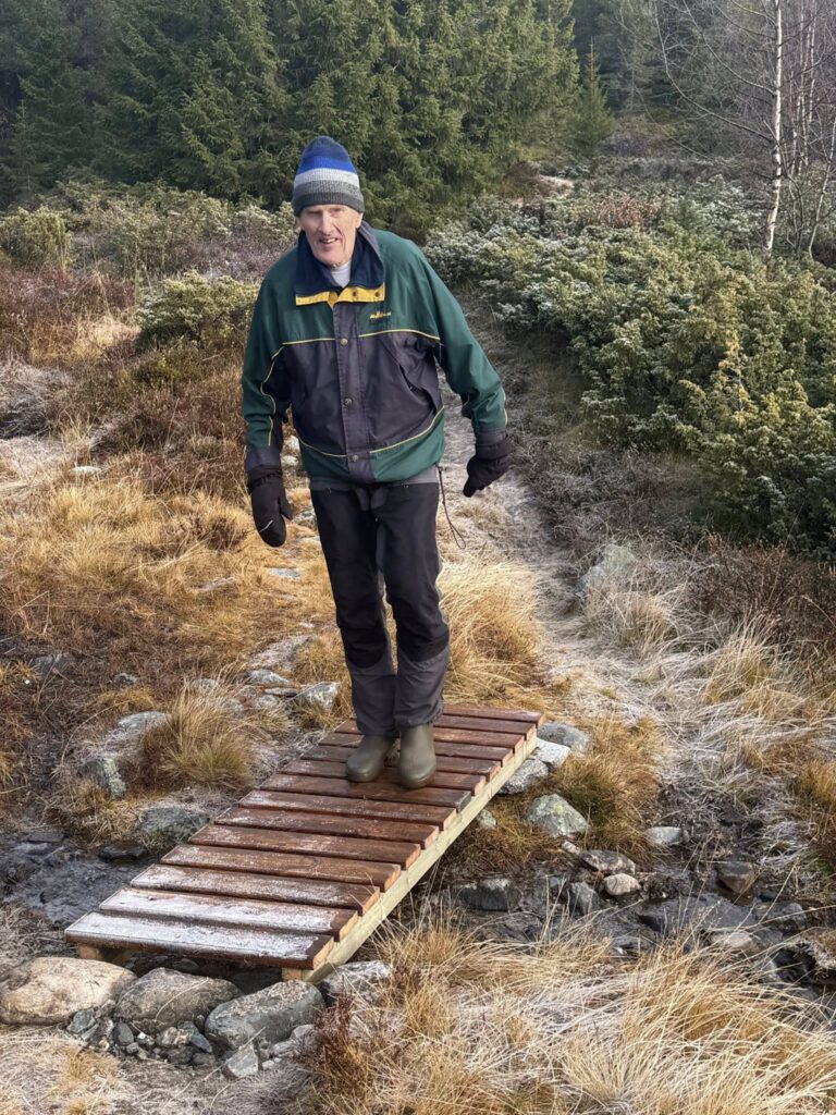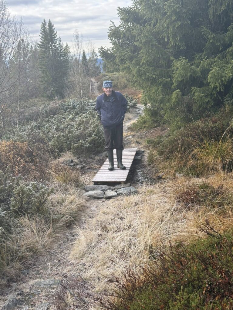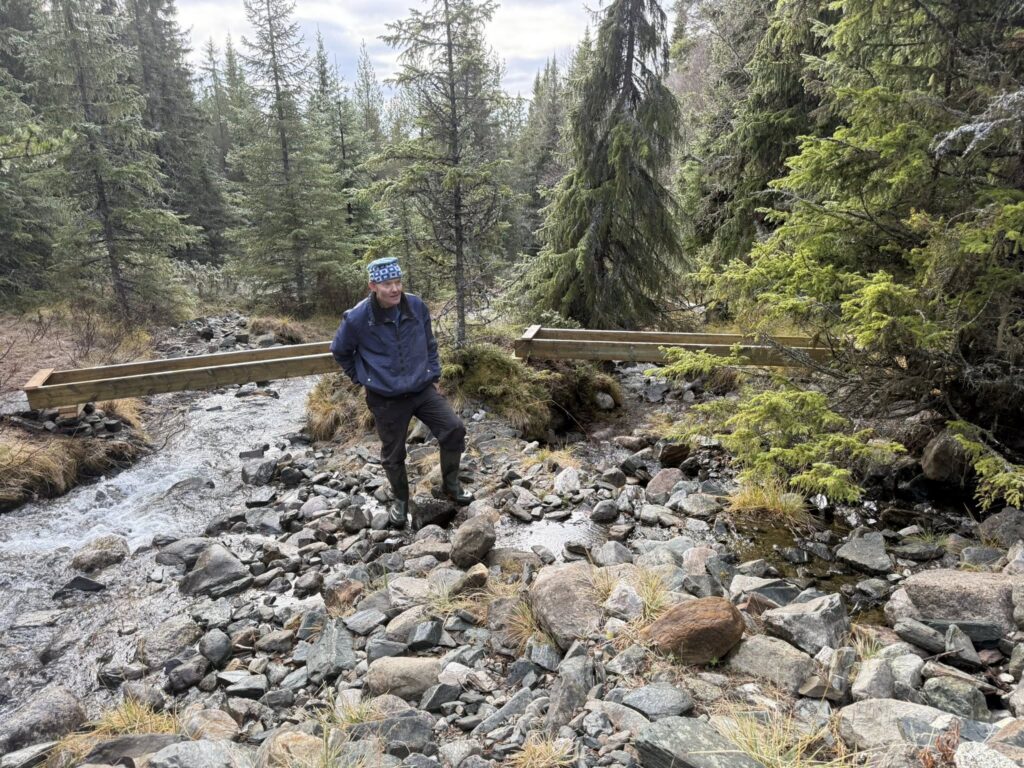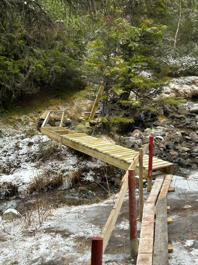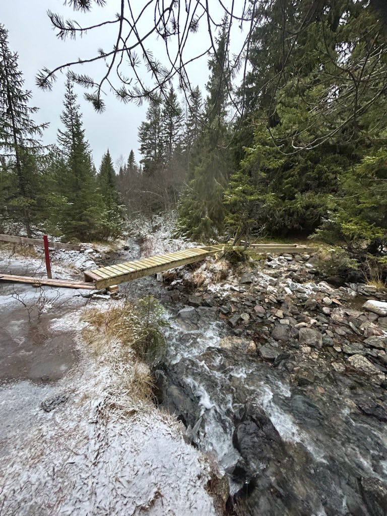 Det er såpeglatt og krevende å komme over bekkene, så det er veldig kjekt og nødvendig å ha ei bru med gelender å støtte seg på.