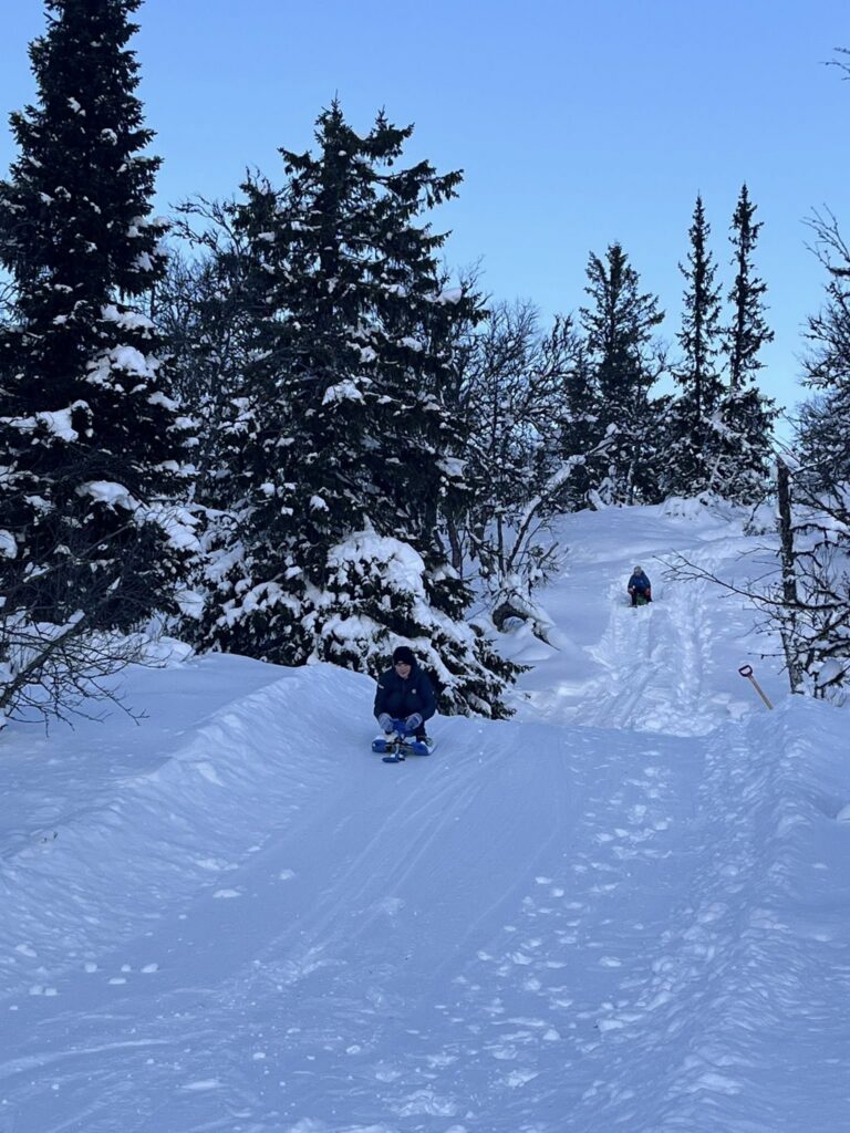 Kaldeste vi hørte i bygda, var 37 blå på Gjelten bru. Sååå absolutt en dag for å komme seg ut og opp i høyden. Og det ble 28 friskuser fra 1,5 til godt over 70år som kom innom stua i dag. Vi lar Ole Mathias og Ida Marie Korsen Nyhus representere disse friskusene med aking i bakken ved Allmannstua.