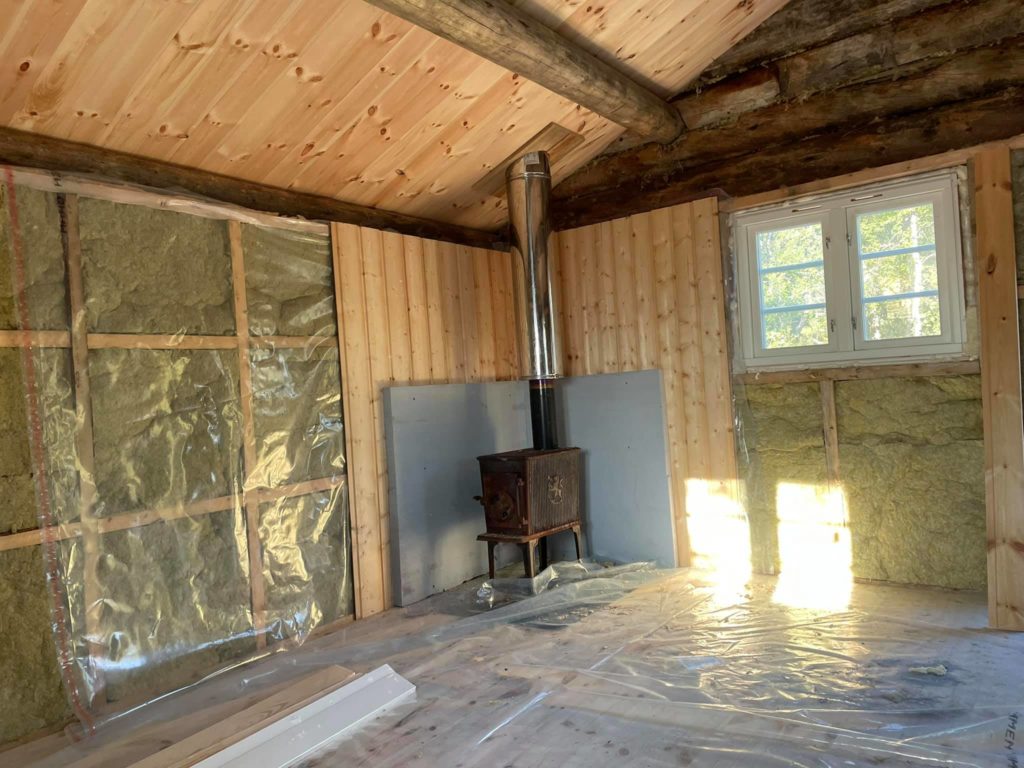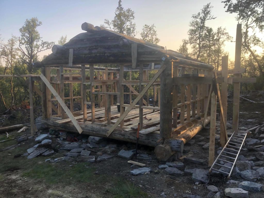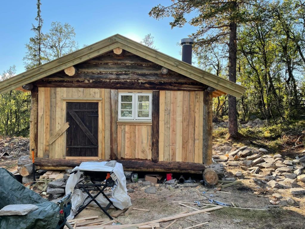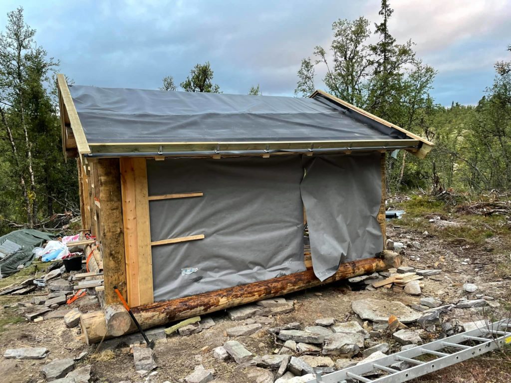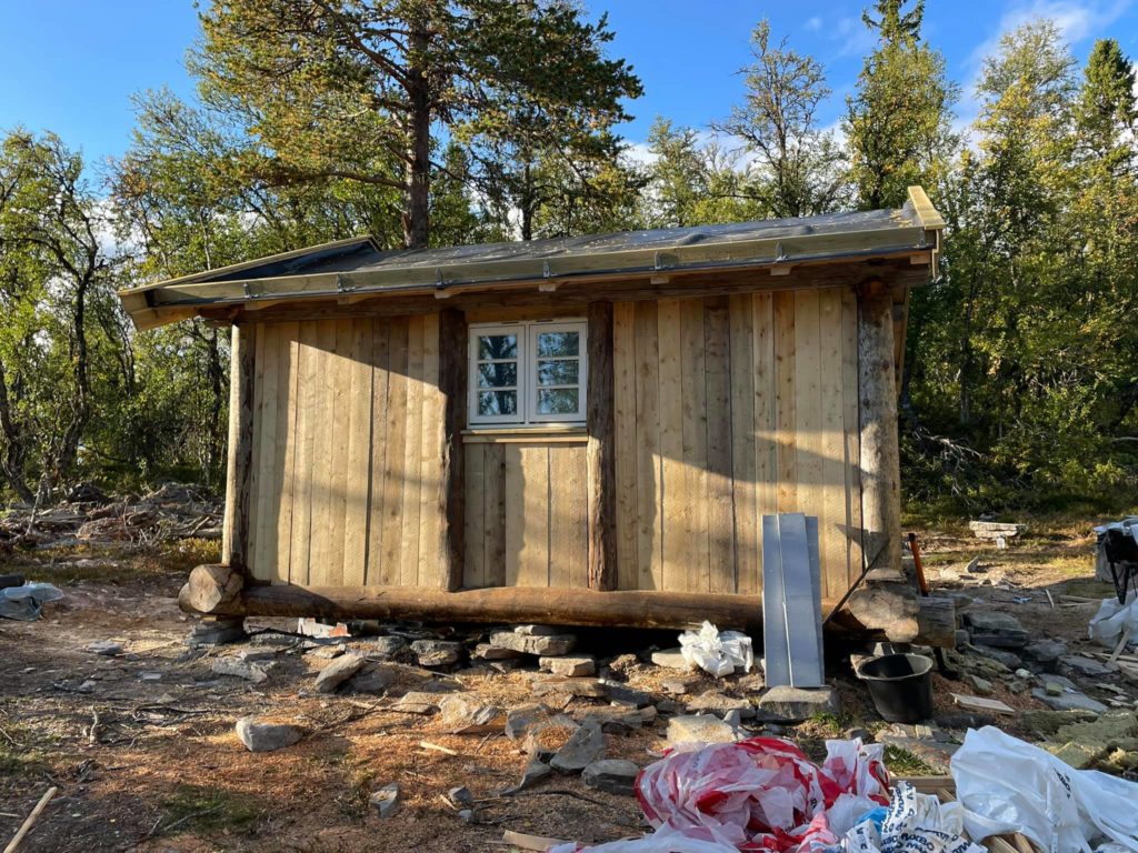 Materialer og utstyr ble som kjent fraktet med snøscooter i våres.På litt over 2 uker har vi fått satt opp igjen stavlaft kassa som ble laget sist vinter, lagt tak, gulv og vegger , isolert og satt inn vinduer, dør og ovn![]()