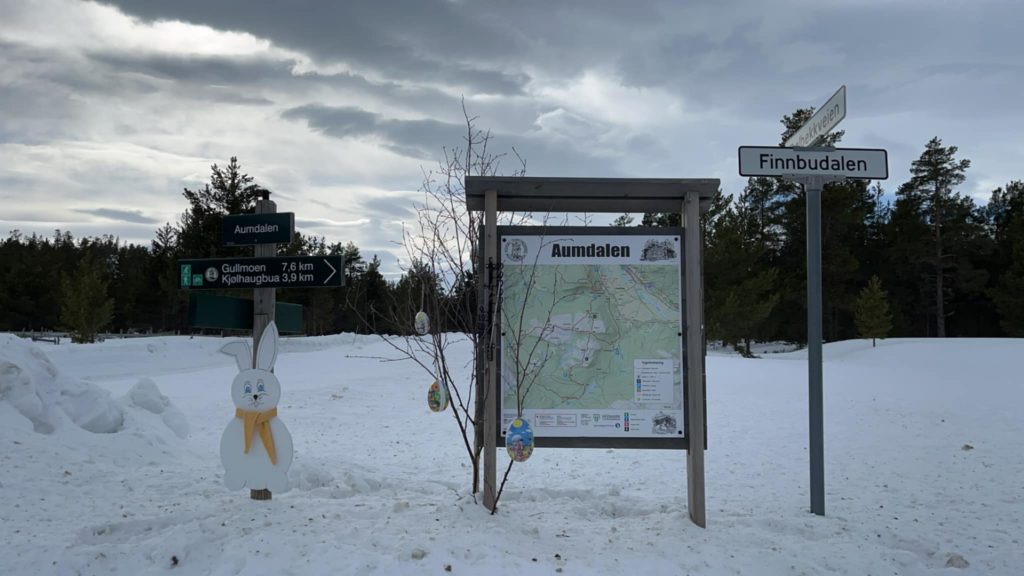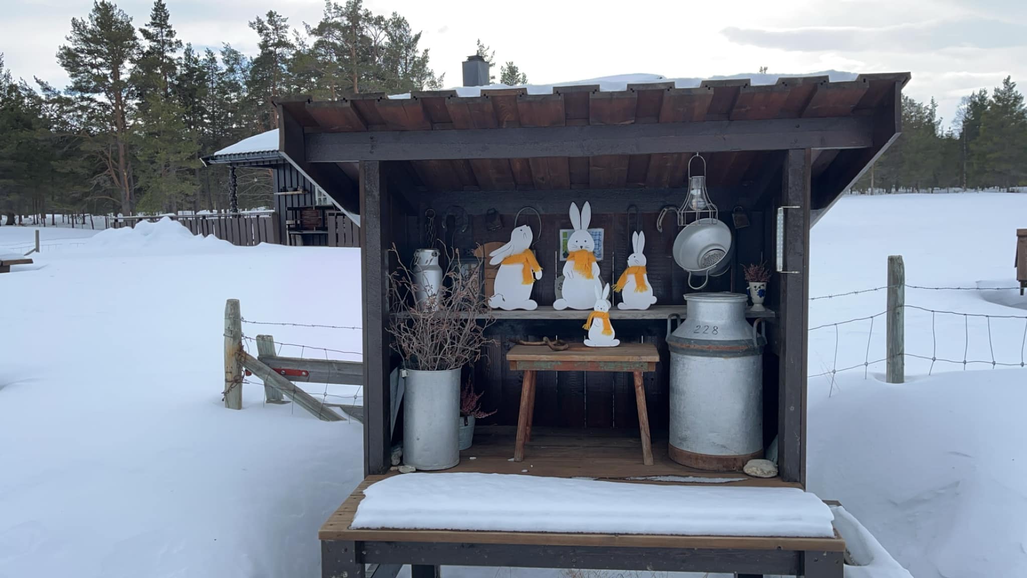 På Anne Marie’s mjølkerampe hadde påskeharen Snipp, Snapp, Snute og Veslesnute flytta inn og blir værende til etter påske og ved skiltene hadde Annemor sørget for både påskeharen og eggene.![]()