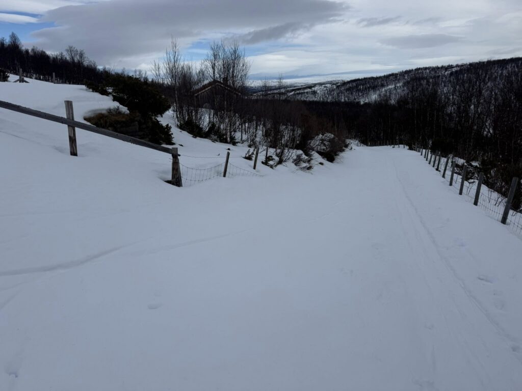 Siste ettappe gikk etter bilveien opp til parkeringa i Gardvikåsen. Her var det blytungt føre med mange varmegrader, vinden hadde nå snudd mer fra nord.