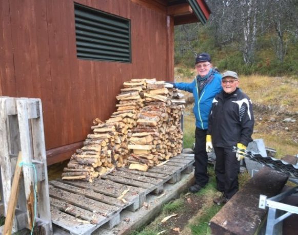 Kjempedag igjen på Allmmanstua med kjempeflott høstvær og 65 gjester innom. Folk kom tidlig i dag, det var tydelig at sommertiden fortsatt satt i kroppen. Dette var siste åpningsdag i høst før vinteren kommer for fullt. Prosjekt "innkasting av veden i vedskålen" har gått litt trått i høst, dvs det har ikke blitt gjort noe i det hele tatt. Forleden dag ble Leif Bakken forespurt om han kunne bidra, likeså Bård Randmæl.Disse gutta er kjent for ikke bare å prate men også sin handekraft! Da vertskapet kom opp i god tid før åpning, var Leif allerede i gang. Ikke lenge etterpå kom Astrid og Bård Randmæl. Noen til som hadde tatt turen opp bidro også og med mange hender på en slik jobb var jobben fort gjort. Begge to har bidratt kjempemye til ymse dugnader på Allmannstua. Takk til alle sammen og særlig Leif og Bård for sin alltid positive væremåte til frivillighten og alle andre.